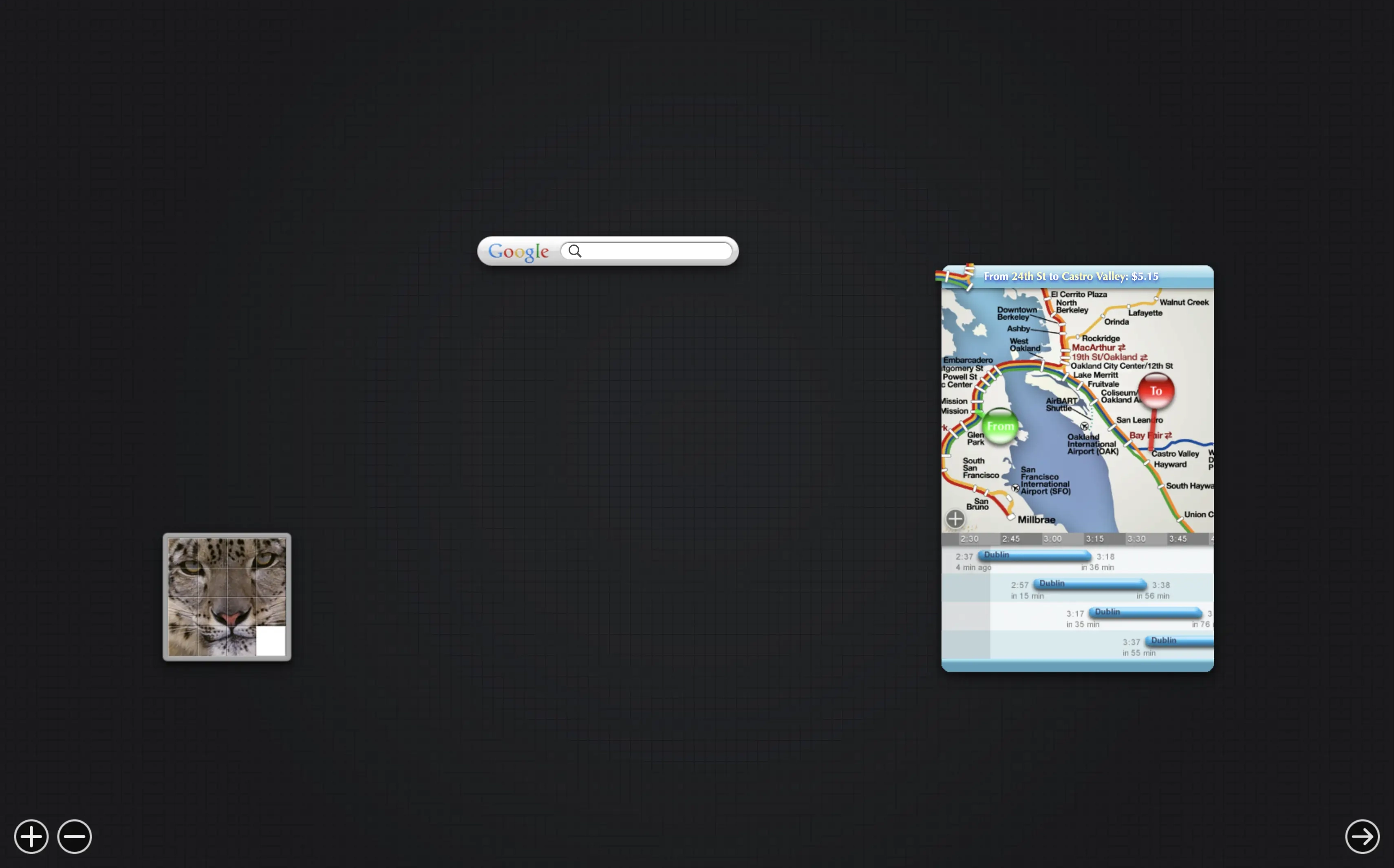 In fullscreen mode, widgets are managed from the + menu. There you will see a grid of your installed widgets. Widgets are grouped by their bundle identifier. To open a widget, click on its icon. If there are multiple widgets with the same bundle identifier, doing that will open a menu from which you can choose which one to open. That menu also allows you to duplicate, delete and modify widgets. To force it to open, ⌥-click the widget's icon. The "New Instance" button duplicates the first instance in the list.