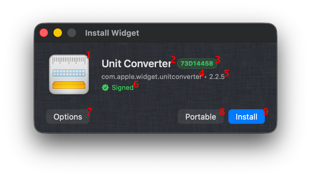 - 6 The widget's codesign status. Can be Signed, Tampered, or in most cases Not signed as only a few newer Apple widgets are signed.